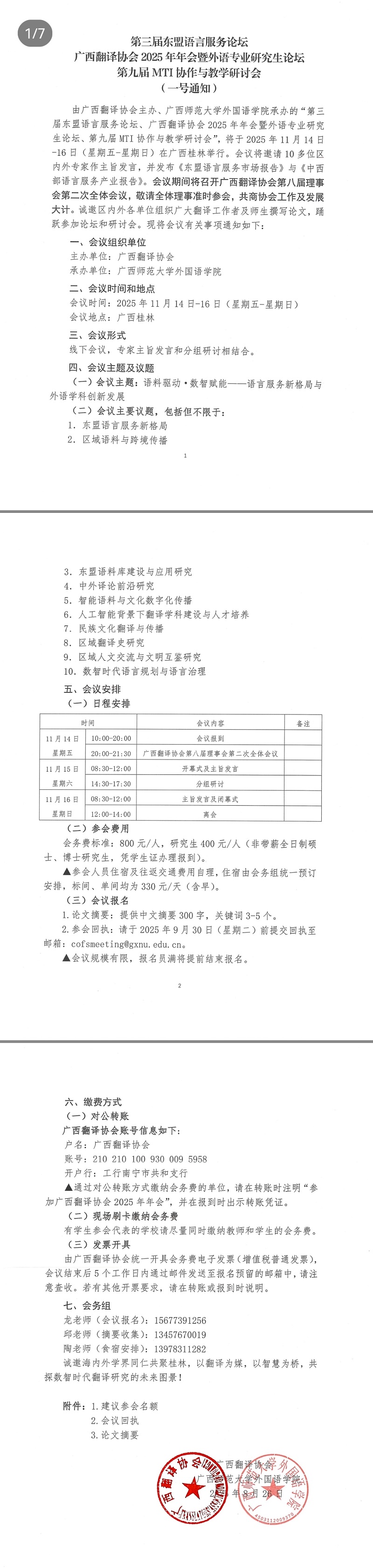 由广西翻译协会主办、广西师范大学外国语学院承办的“第三届东盟语言服务论坛、广西翻译协会2025年年会暨外语专业研究生论坛、第九届MTI协作与教学研讨会”,将于2025年11月14日-16日(星期五-星期日)在广西桂林举行。会议将邀请10多位区内外专家作主旨发言,并发布《东盟语言服务市场报告》与《中西部语言服务产业报告》。会议期间将召开广西翻译协会第八届理事会第二次全体会议,敬请全体理事准时参会,共商协会工作及发展大计。诚邀区内外各单位组织广大翻译工作者及师生撰写论文,踊跃参加论坛和研讨会。